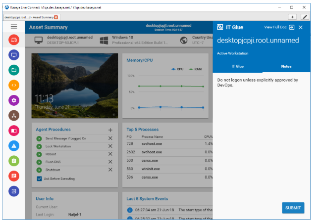 To get more information on the agent, clicking on View Full Doc will launch your default browser to the IT Glue portal where you will see all information associated with the agent. If you do not have an active IT Glue session, you will be asked to log in.