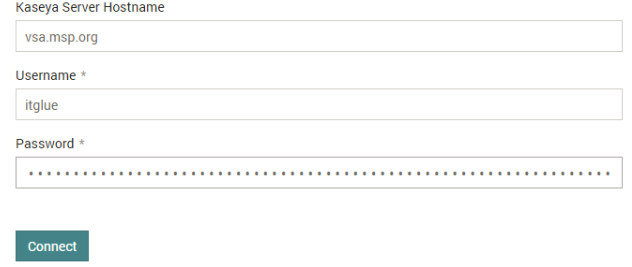 - Enter your VSA server URL (i.e., vsa.msp.org) and master user account credentials and click on Connect.