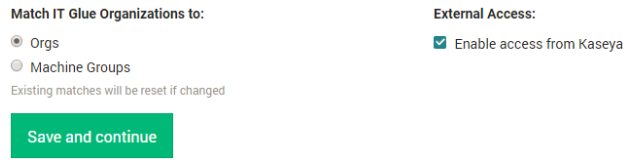 Figure 1: It is not required to fill in the protocol identifier (i.e., https://) for the VSA URL. In this example, we’re using itglue as the master user account. - Once credentials are authenticated, choose your preferred matching option, check mark Enable access from Kaseya, and click on Save and continue.
