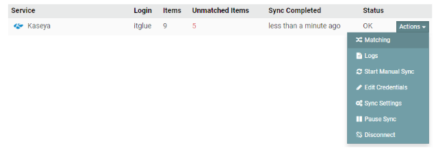 Figure 5: This is the final step of the matching process between VSA endpoints to IT Glue configurations. - Verify from the VSA that the integration is enabled by logging on your VSA master user account and going to System > Customize > IT Glue. Enable integration with IT Glue should be check marked and the URL of the IT Glue server automatically filled in.
