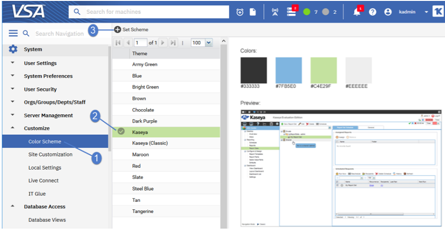 The Color Scheme page determines the set of colors displayed by the VSA user interface. Color Scheme selection applies to all users within the same partition.